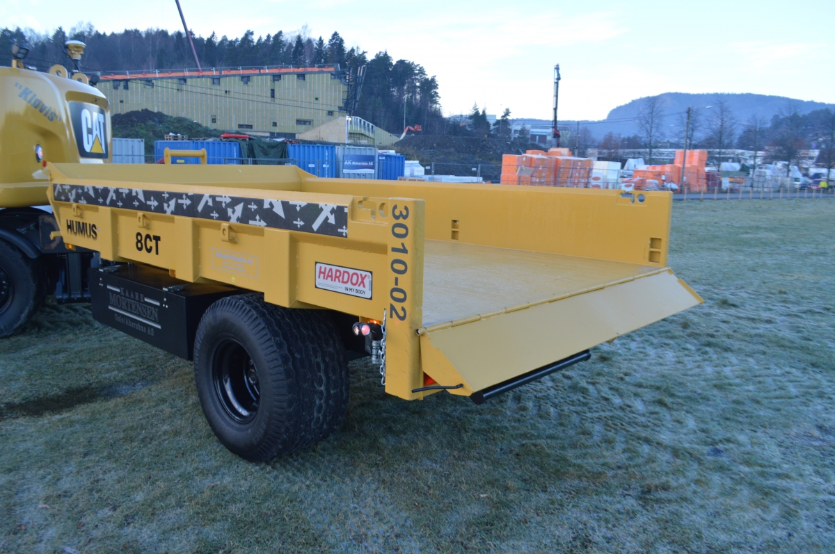 Dumper tilhengerne 8CT er konstruert med Hardox 450 stål i dumper kassa og er sertifisert ihht Hardox in my body standarden fra Svenske SSAB, noe som gjør dem fryktelig robuste og slitestreke. Sideveggene og bunnen av dumper kassa har forsterkninger i Hardox for og øke styrken på kassen. 8CT hengeren har en meget gunstig planhøyde med tanke på av og på kjøring av gravemaskin kun 103 cm med 500/50-17 dekk samt en buet fram vegg tilpasset bruk sammen med gravemaskin, kan og fåes med fjærende drag!